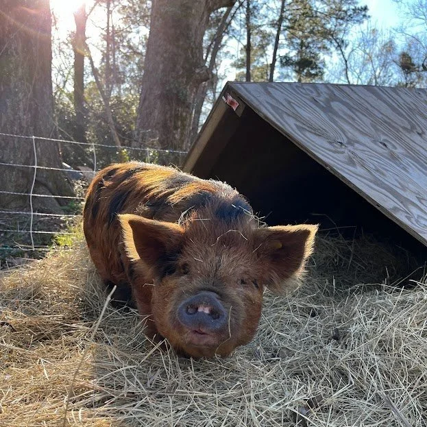 We found a farm a couple hours away who specialize in breeding registered Kune Kune hogs and have maintained several different bloodlines. They still had one boar from their May 2022 litter which lines up nicely with our females ages so we jumped on the opportunity to buy him. We loaded up the dog kennel yet again and hit the road for a two and a half hour drive there. Once we got there we saw they have a beautifully organized operation and several Kune Kune boars and sows and even some new babies. It was so neat to see all the different color combinations and how large the parents had gotten to gauge our future boars size. We met the little guy we would be bringing home with us and he was even more handsome in person. Long vibrant red fur with black spots dotting his sides and eyelashes that would make any girl jealous. He laid down for us to give him some scratches before we filled out the registration paperwork and loaded him up for the long drive home. Once home we got him into the netting with the ladies which we had doubled the size of to give them more room and he immediately went and buried himself in the little house we have for them. Guess he will take a little time to get used to his new home but we think he makes a fabulous edition to the ranch.