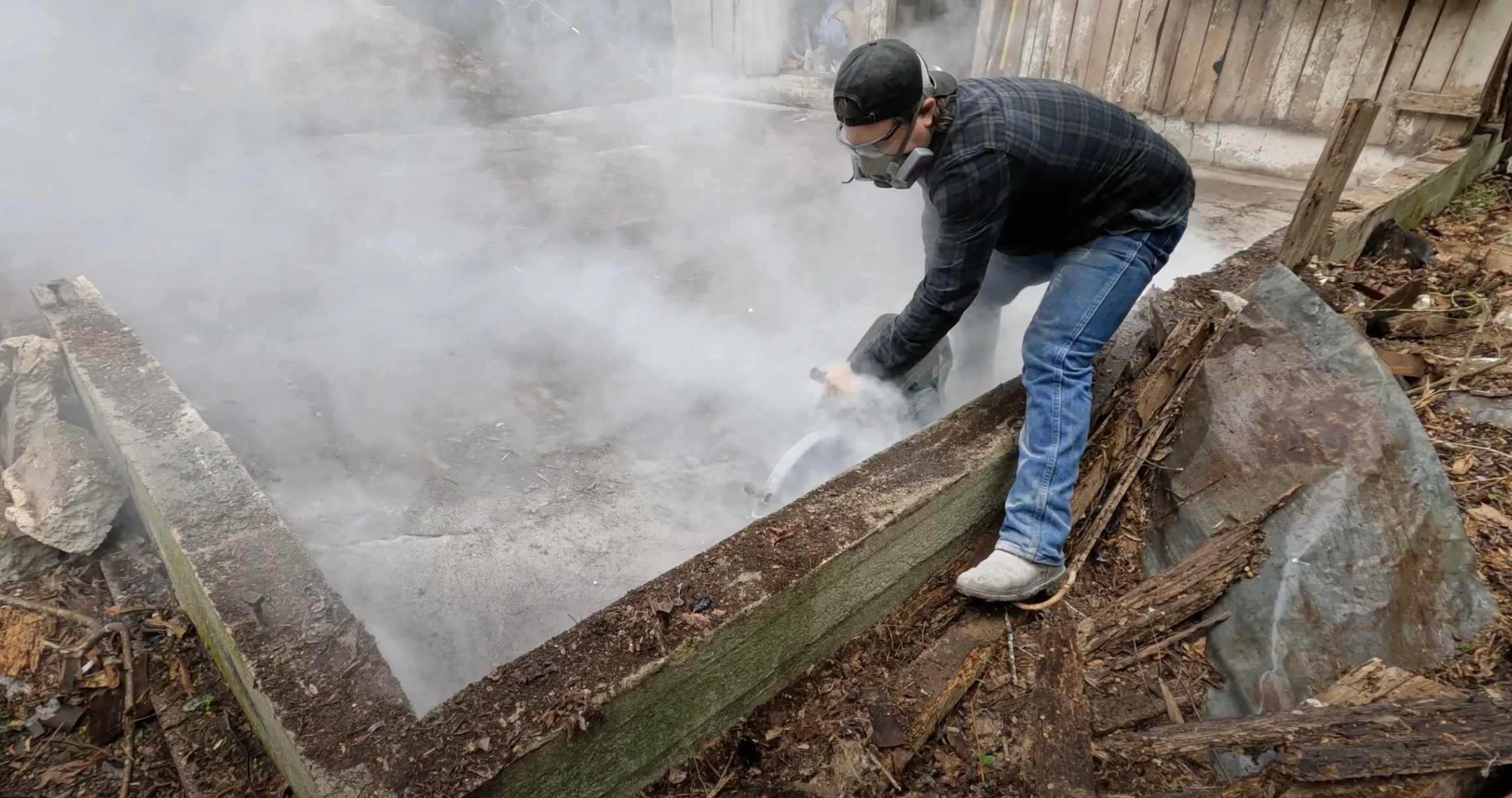 Jaken and his grandpa got started on working with Jaken making cuts into the concrete walls on the perimeter of the barn. They way it was built was a flat concrete floor with a center strip taller than the sides and on the edges they rose to about a foot tall for the walls to sit on. These mini walls were badly deteriorated and cracking so removing them is the best route to take while protecting the existing floor foundation. Jaken used the saw to cut around the edges of these so that grandpa could take the tractor and pull them away from the rest of the structure.