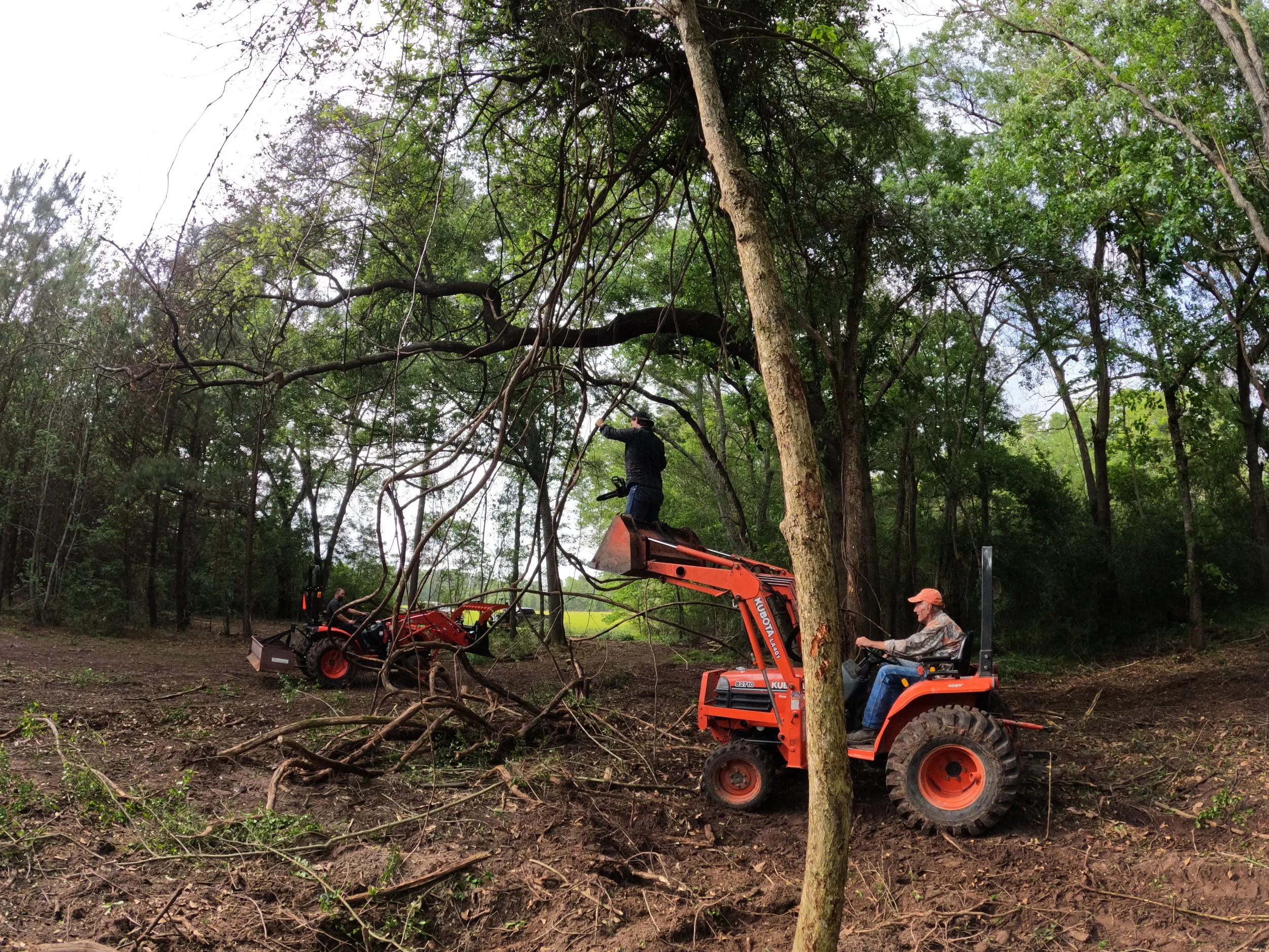 When Jeremy returned Jaken unloaded the mini-ex and started driving it into the barn area. It was quite slow moving but pretty fun to watch him drive. They then got started digging some pretty big holes for all the concrete to go into. Jeremy seemed to be having a blast and after he got all the concrete in the hole he decided he would go ahead and start working on the old fence and just pull that in the hole and then onto several small intrusive trees and bushes and by the time he was done we had a whole opened up back yard to explore. He managed to save all the large trees and just take out the smaller ones and their stumps, tons of the majorly invasive grapevines, and all of the fence. Steven had been able to come over with his new tractor which has a cool claw attachment that just picks up whole piles of trees and carried them over to the burn piles. That tool really helped expedite the clean up process tenfold. The whole area looked transformed and that’s saying something considering they had already done a decent amount of clearing prior to this weekend.