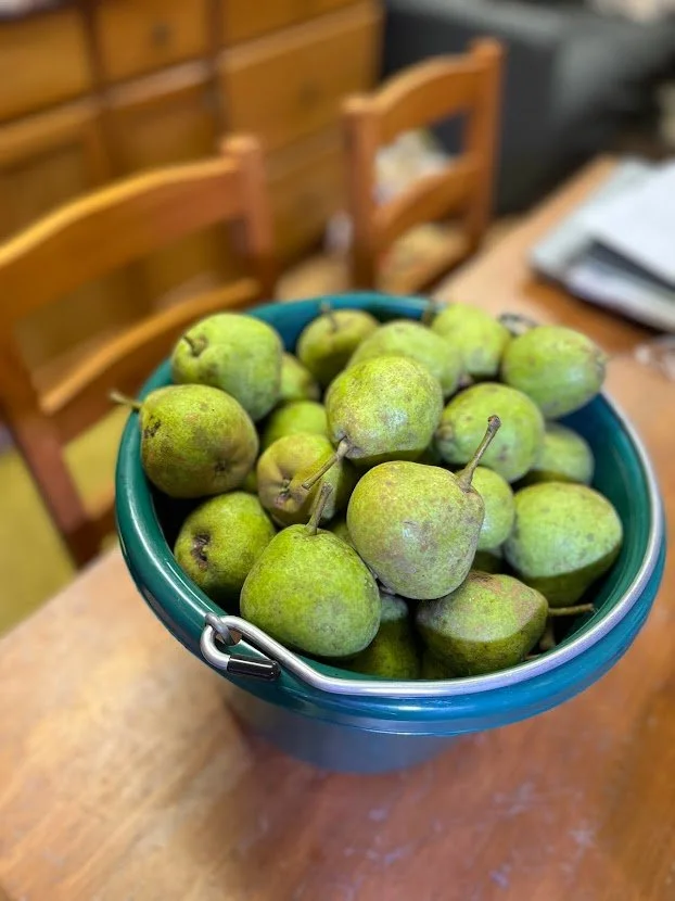 As previously mentioned we have a very interesting looking pear tree on the property. The trunk is very strange in the way that it is an entire trunk at the very bottom, all cracked and hollow going up the middle, and then bursts out with a bunch of small branches up into proper tree limbs with leaves and tons of small pears. We’ve been waiting for these pears to ripen all summer and being first time pear harvesters we really have no idea what being ripe means. Our cousin told us that some pears need to ripen off the tree so once ours got to a size that appears “good” and started to get that typical pear coloration we picked them.