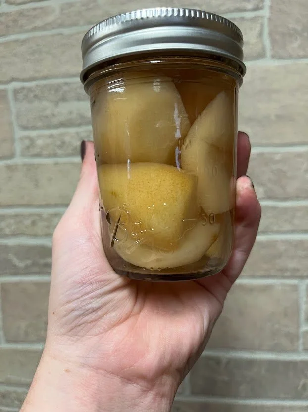 Once the syrup was ready I added as many pears as I could fit into the pot and let them cook for a few minutes. While they were heating I took the jars out of the canner and placed them on a table to prepare to fill. Using the funnel and a ladle I squished as many pears as I could into the jars while maintaining space at the top as instructed by the google link I found on how to can. After filling the jars with the pears I went back and added syrup to fill in the holes and used the bubbler to make sure, you guessed it, there were no bubbles. Next I wiped the edges clean and capped them all with seals and lids. Back into the canner they went, lid went on, and once I was confident we were boiling I walked away for a bout twenty minutes.