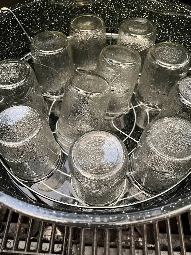 We started by peeling and chopping all the pears into halves or quarters depending on their size and then letting them soak in a lemon juice and water concoction to keep them from browning. Once they were all ready to go I got my canning station set up. Since we don’t have a proper stove in the trailer I decided to use the next best thing…the grill. I got my metal pot heating on one side with water and sugar for the syrup while the water bath canner took the other side and started heating the jars.