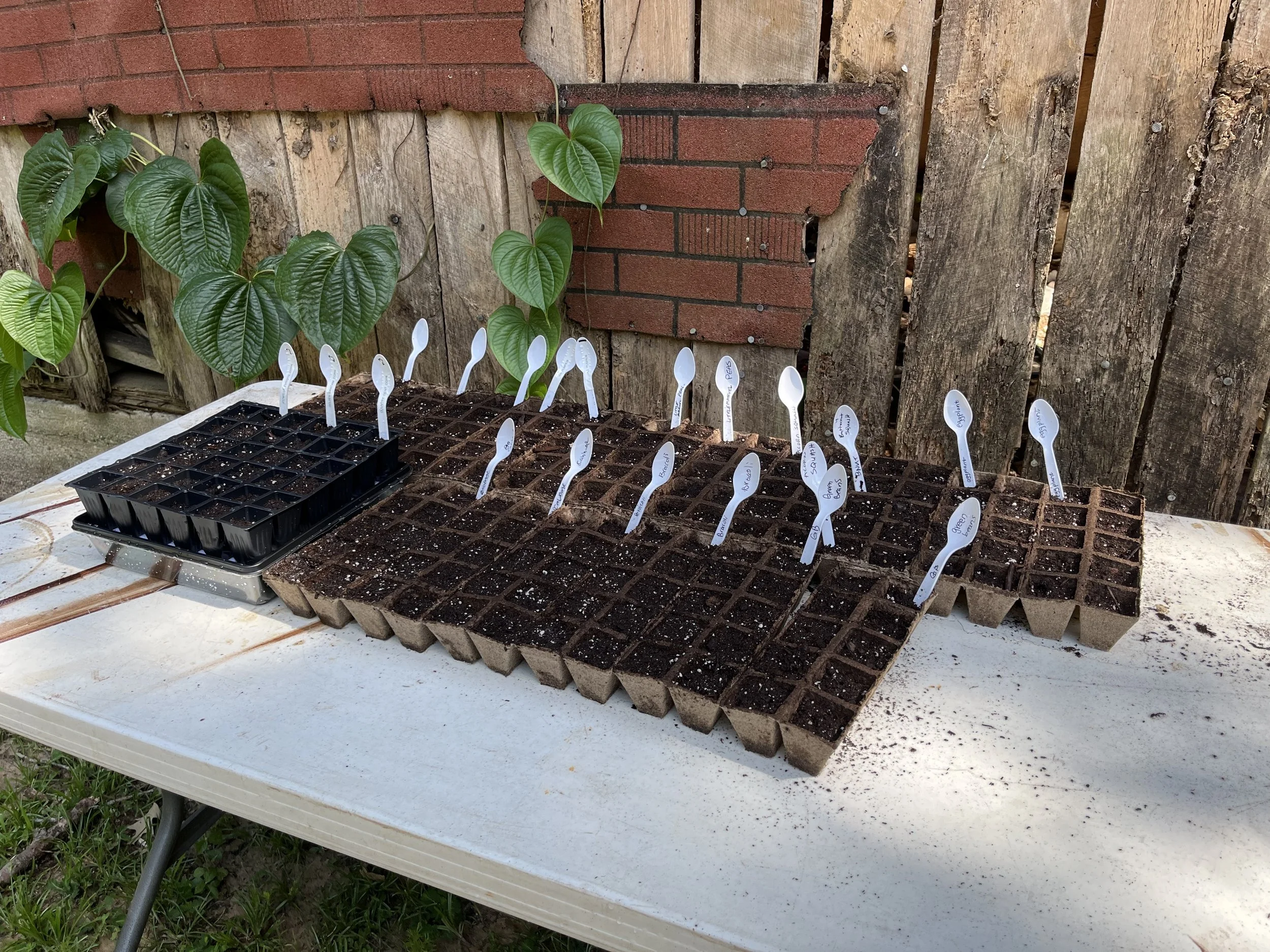 So now that we are officially here and all of our things with us we have gotten to work. We had ordered several packets of seeds back a few months ago and now we are getting them started for a fall garden. We mostly have decided where the garden is going to go and how big we can make it as well as watering solutions. So we got some seed starting containers, soil, and started planting. We planted three kinds of corn, eggplant, squash, green beans, peas, broccoli, cabbage, and pumpkins. We forgot to buy popsicle sticks or label sticks though and had to get creative with some plastic spoons…hey you do what you gotta do. After getting all of those tucked in their tiny soil homes we sat them out by the barn to maximize their sun exposer and keep them away from the kittens.