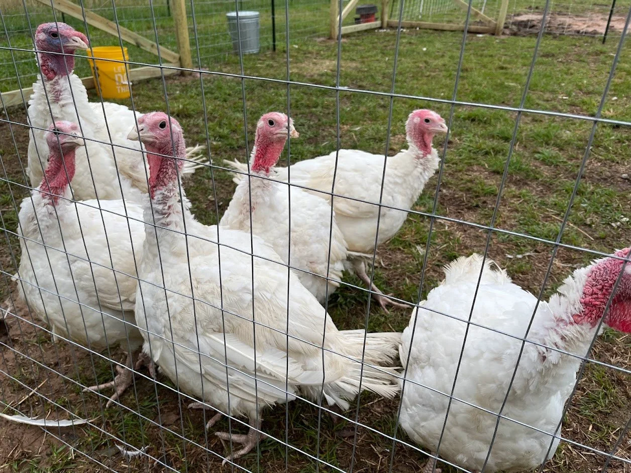 Jaken’s aunt and cousins raise broad breasted white turkeys for show and once their rodeos are done they send them to process for sale. This year she asked Jaken if he wanted some to add to the ranch and obviously we love to add anything we can to the family so we eagerly said yes. She rolled up and strapped to the trailer in cages were five plump hens and one regal looking tom. They unloaded them and deposited them into the other 30 x 30 pen Jaken had just finished building and the hopped around happily honking in their new home. With that we increased our fowl count to six turkeys and twenty one chickens with seven more on the way.