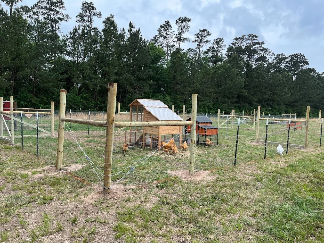 While the men were working on fence, Hope and I became chicken wranglers. I figured the best way to move them over would be to load everyone into a large dog kennel we have and then use the tractor to carry them over before coming back for the coops. So I ran around the run like a chicken with its head cut off (pun intended) trying to herd these hens and two roosters into a dog crate. Hope did her best to guide them but, she’s a baby so…you know how it goes. Finally after half an hour we got all the chickens boxed up and ready to roll. I got the coops cleaned out and feeders gathered up before we started the trek to the new pen.