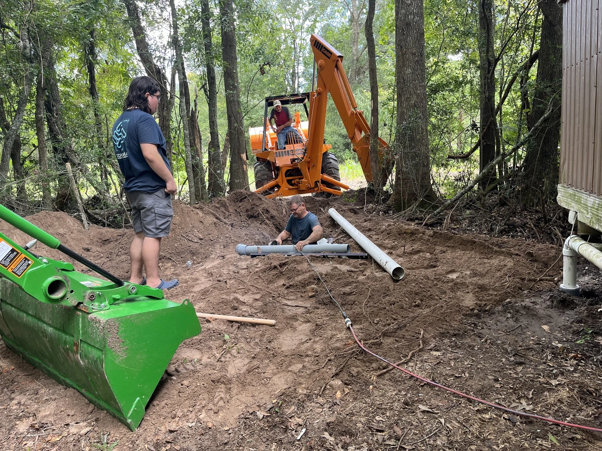 He got a whole large enough dug and cleared out some of the trees for the piping to go out towards the garden area. Jeremy got in the hole and got the pipes laid where they would be connecting to the tank.
