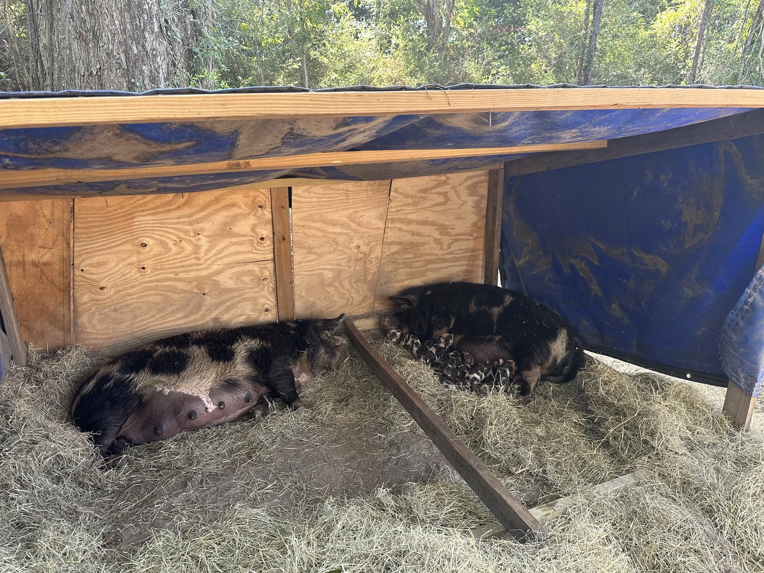So after much panicking and running and drinking water and panicking we called up the troops and got to work. Our cousin Steven ran to the store to get some wood, our cousins Jason and Lisa came and picked up Hope and played with the new babies for a bit, and we hit the Tractor Supply for..you guessed it..supplies. Hog panels, posts, tarps, water tank bushing and nipples, and all the things we could think of in the moment. We are recovered at the pig pen and got to work. The guys threw together a rather impressive farrowing pen for each momma, Lisa and her kiddos helped me juggle Hope and the new babies making sure none got crushed by their mom…or Hope.