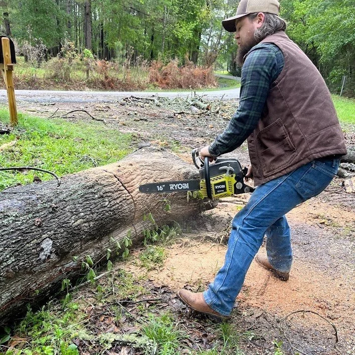 As I mentioned previously spring has sprung on the ranch and with that comes rain. Apparently a little rain and wind was all this tree needed to just topple down right across the driveway perfectly between the gate and the mailbox. Jaken got out the tractor and chainsaw and went to work bucking it up before clearing it all away to the burn pile. Once that challenge was done we got set on a new one. Clearing around the pecan tree.